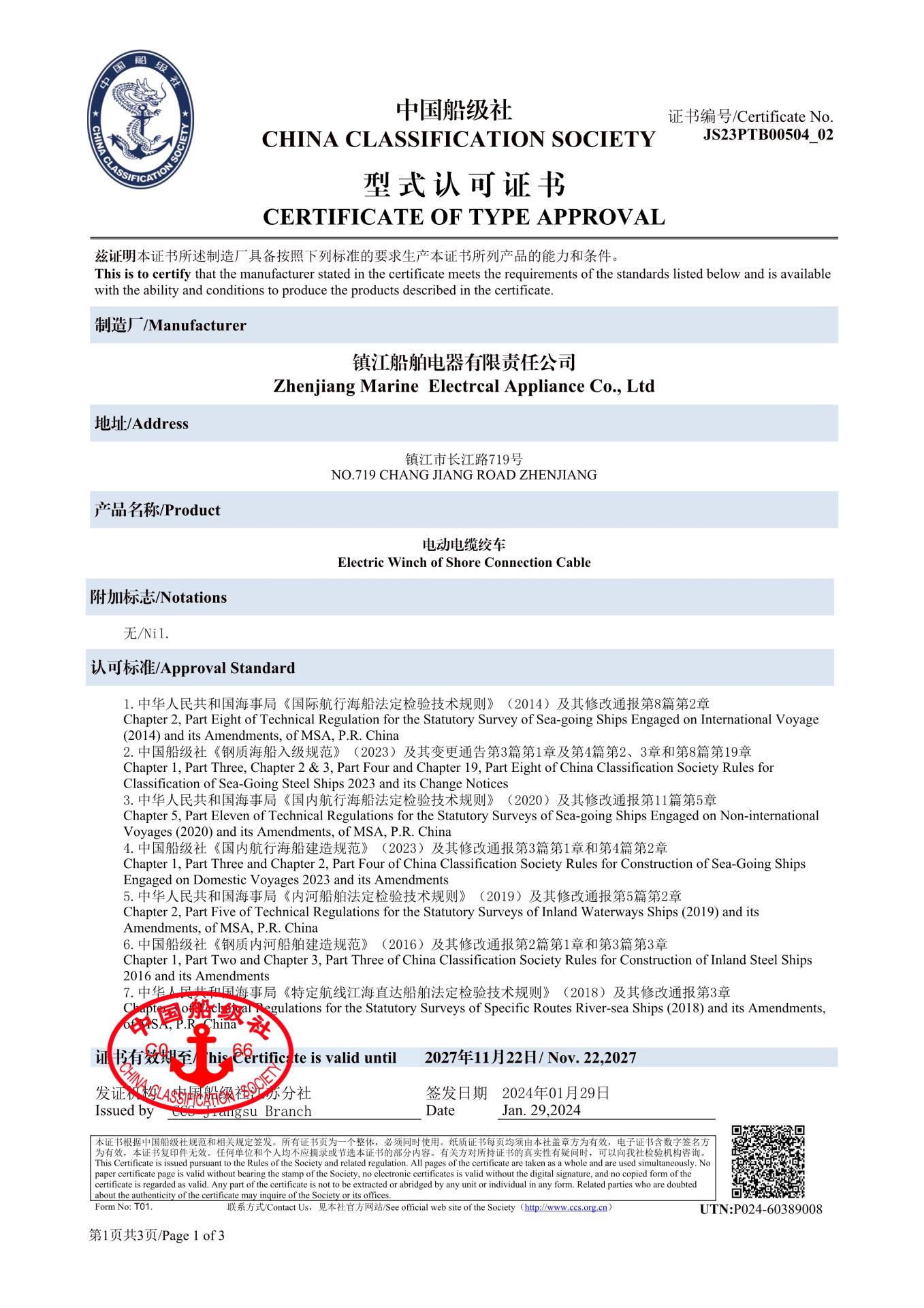 電動電纜絞車型式認可證書