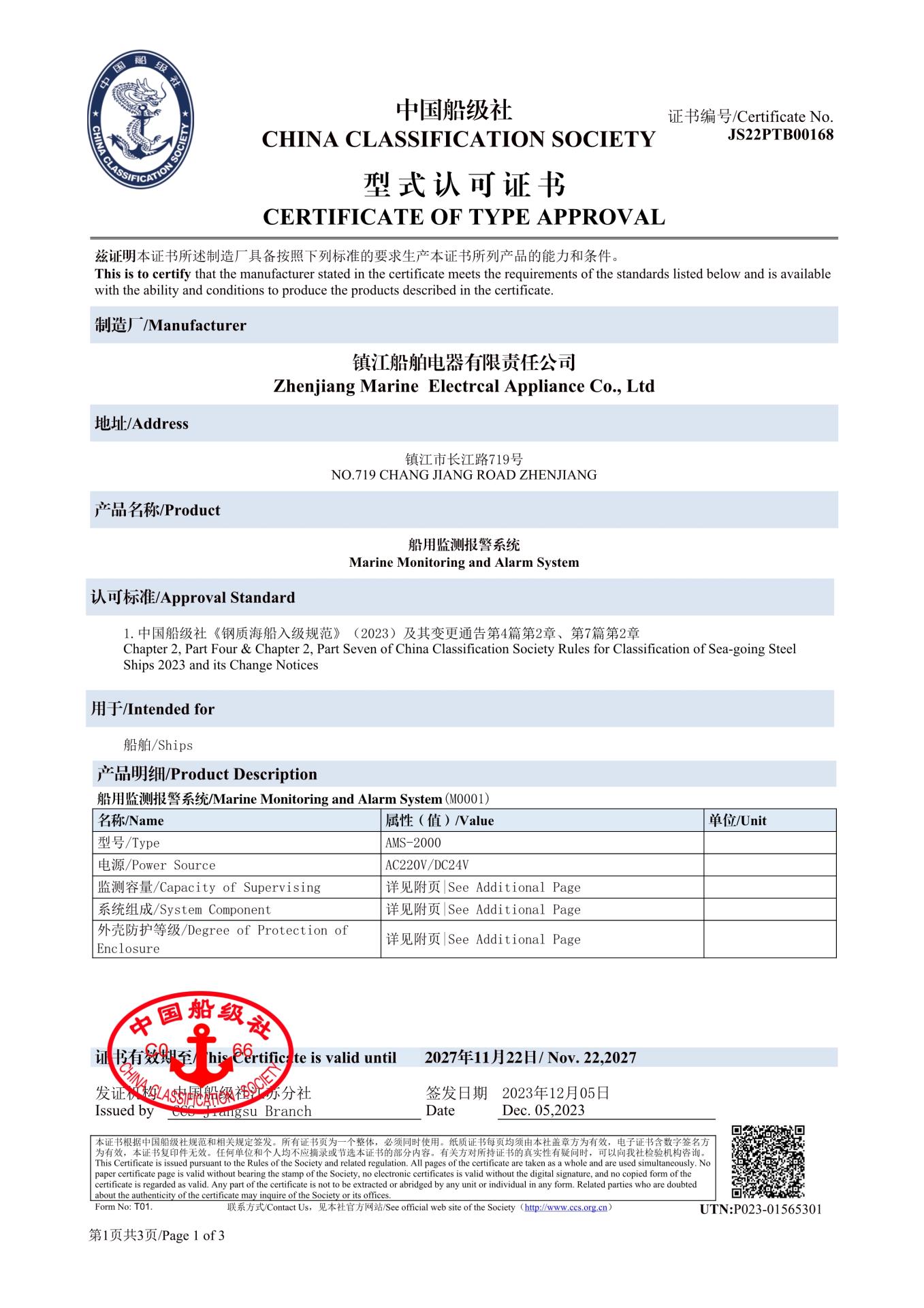 船用監測報警系統型式認可證書